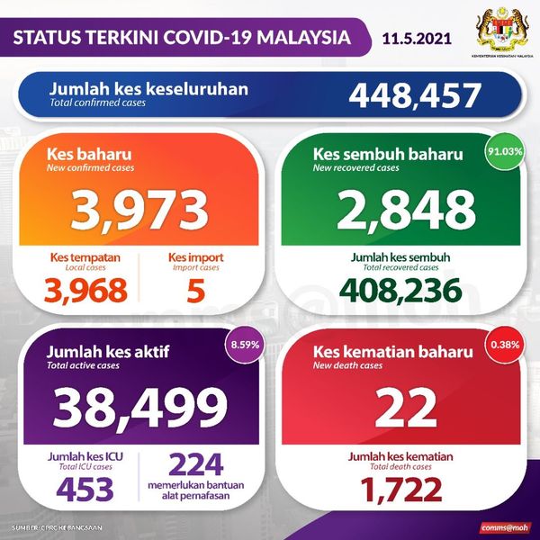 据卫生部官方脸书于5月11日发布文告,今日新增3973宗确诊病例,有5宗为境外输入,3968宗为本土病例,累计活跃病例3万8499宗(8.59%)