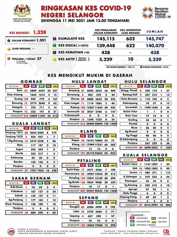 据雪州卫生局5月11日在脸书公布的数据显示,雪州今日有1073人痊愈出院,累计痊愈病例14万70宗,目前活跃病例有5239宗。