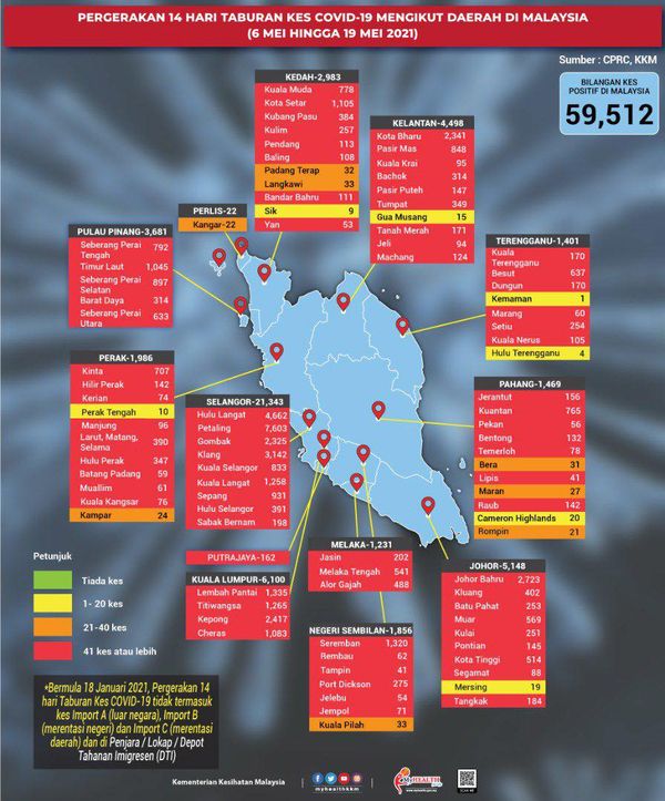 卫生总监丹斯里诺希山医生5月21日通过脸书发布数据图说,卫生部危机准备及应对中心(CPRC)按县区分布的14天新冠确诊病例移动数据(5月6至19日)显示,半岛已无绿区。