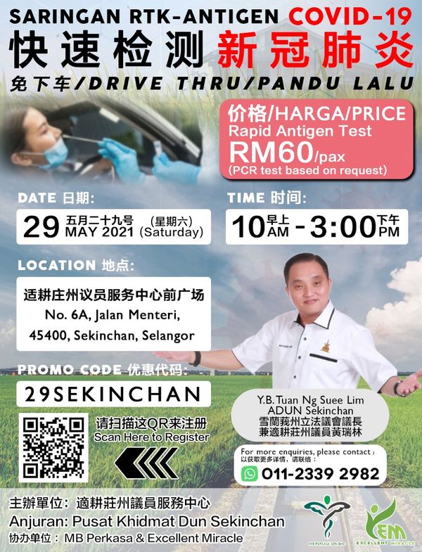 (适耕庄27日讯)为截断疫情传播链,适耕庄州议员黄瑞林将在本周六(29日),主办新冠肺炎病毒快速抗原检测试剂盒(RTK Antigen)活动,收费60令吉而已!