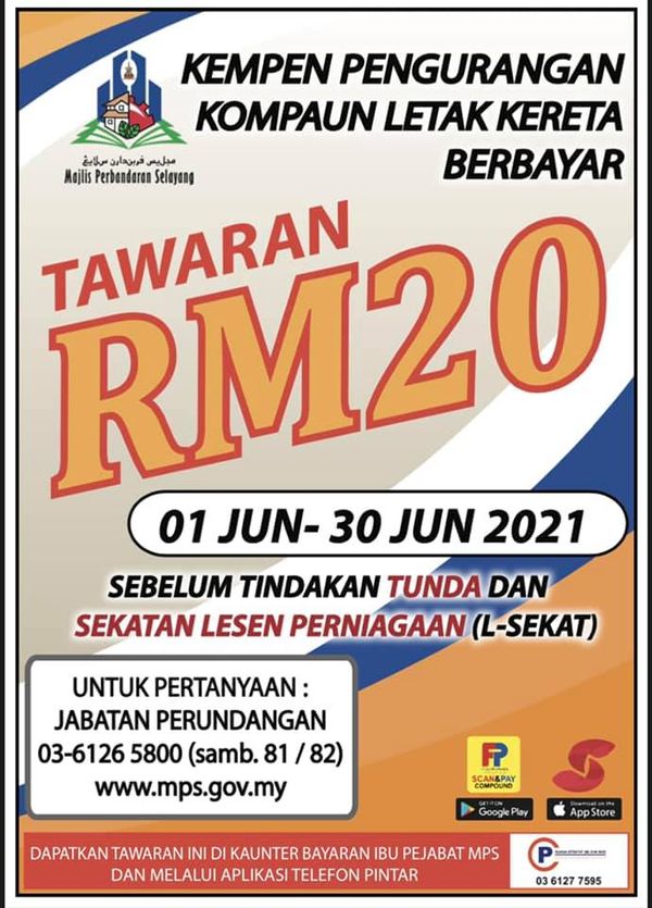 (莎阿南4日讯)士拉央市议会(MPS)交通违例罚单即日起至6月30日,提供优惠价,每张20令吉。