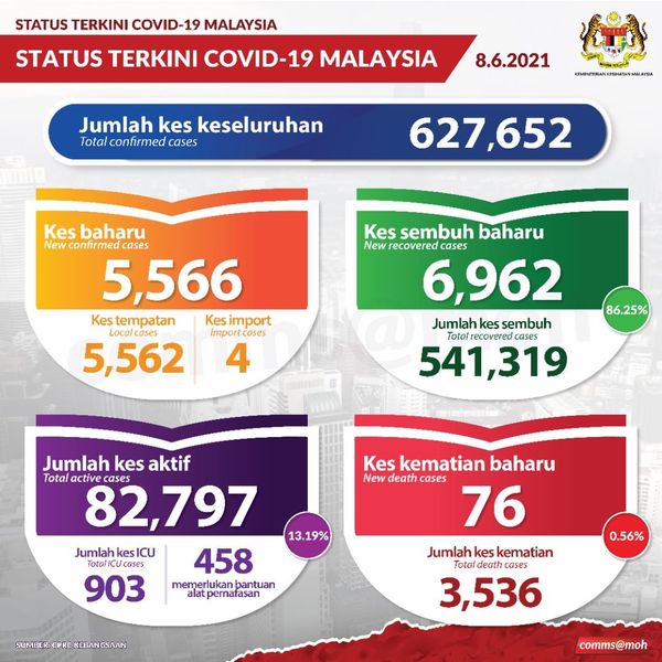 卫生总监丹斯里诺希山6月8日发文告指出,今日新增5566确诊病例,其中4宗为境外输入,累计病例达62万7652宗。