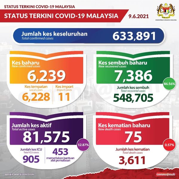 卫生总监丹斯里诺希山6月9日发文告指出,我国今增6239宗确诊病例,其中11宗为境外输入,累计病例达63万3891宗。