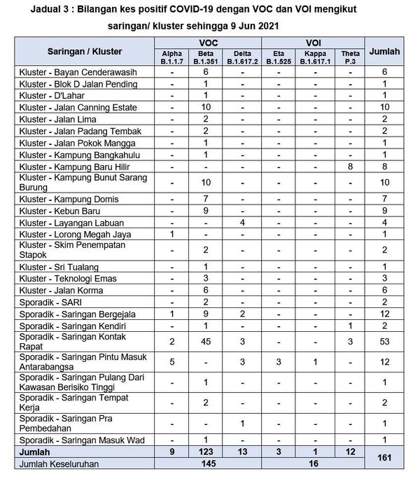 他6月10日通过脸书发布相关数据时说,截至昨日,被列为变异毒株及待观察毒株(VOl)的SARS-CoV-2病毒病例累积161宗,其中145宗是VOC病例,另16宗为VOI病例。