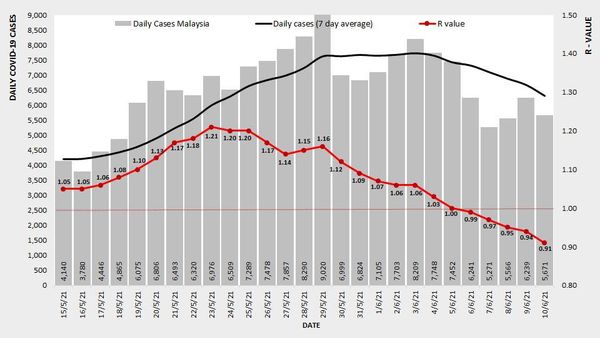据卫生总监丹斯里诺希山6月10日在脸书发布数据图,我国连续5天,病毒基本传染数值在1.0以下。