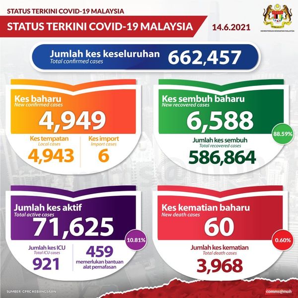 卫生总监丹斯里诺希山指出,我国今日新增4949宗新冠肺炎单日确诊病例,其中6宗为境外输入,累计确诊病列66万2457宗。