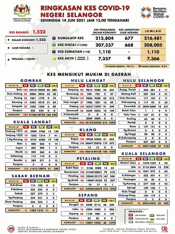 据雪州卫生局6月14日发布的数据图,我国今增4949宗病例,雪州仍是最高病例的州,通报1523宗,州内累计确诊病例达21万6481宗。