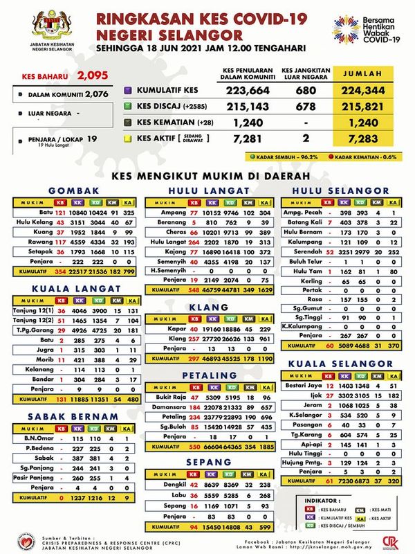 据雪州卫生局6月18日发布的数据图,我国今增6440宗病例,雪州仍是最高病例的州,通报2095宗,其中19宗来自监狱或扣留所,州内累计确诊病例达22万4344宗。