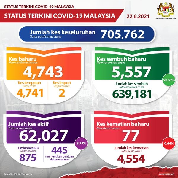 卫生总监丹斯里诺希山指出,我国今日新增4743宗新冠肺炎单日确诊病例,其中2宗为境外输入,累计确诊病列70万5762宗。