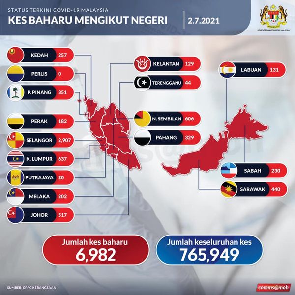 据卫生部7月2日发布的数据图,第二高新增病例的是吉隆坡631宗,接下来森美兰606宗、柔佛517宗及砂拉越440宗。