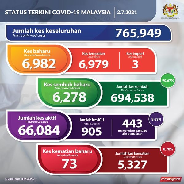 卫生总监丹斯里诺希山7月2日发文告指出,我国今增6982宗新冠肺炎单日确诊病例,其中3宗为境外输入,累计确诊病列76万5949宗。
