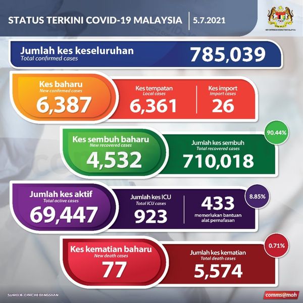 卫生总监丹斯里诺希山7月5日发文告指出,我国今增6387宗新冠肺炎单日确诊病例,其中26宗为境外输入,累计确诊病列78万5039宗。