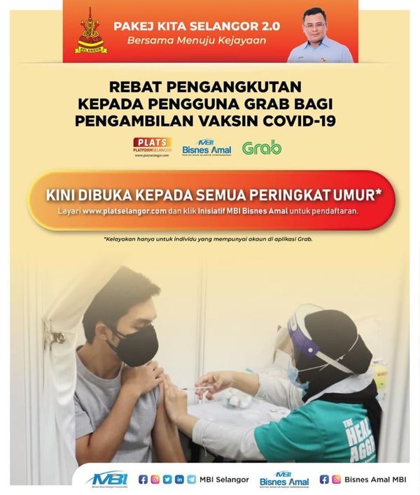 “我早前宣布,凡50岁以上的雪州人民搭Grab电召车往返接种中心可获得20令吉车资折扣,如今这项计划公开给各年龄层有所需要的民众申请。”
