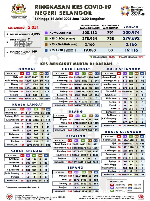 据雪州卫生局7月14日发布的数据图,我国今增1万1618宗病例,雪州是最高病例的州占5051宗,当中7宗境外输入及149宗来自监狱或扣留所,州内累计确诊病突破30万974宗。