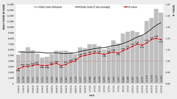 (莎阿南17日讯)全国新冠肺炎病毒传染基数(Ro)在7月16日略降1.19,雪兰莪州则同样是1.19。