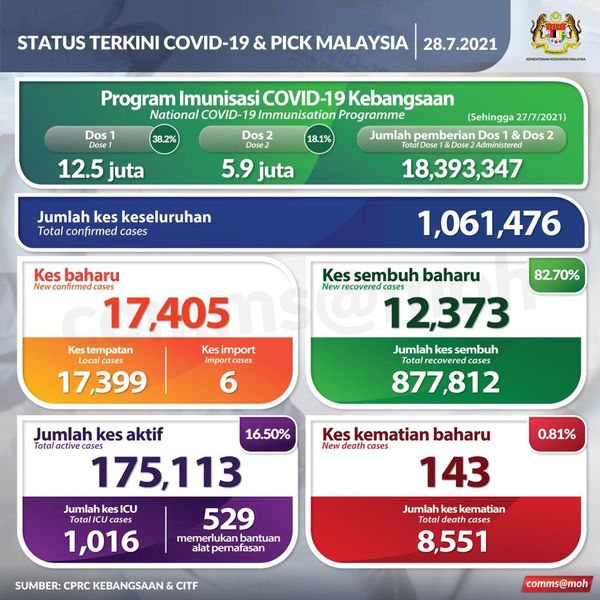 他说,我国今日通报1万7405宗病例,是最高病例的一天,6宗为境外输入,本土病例中,有1万4341人(82.4%)为公民,另3058(17.6%)是非公民,累计确诊病例106万1476宗。