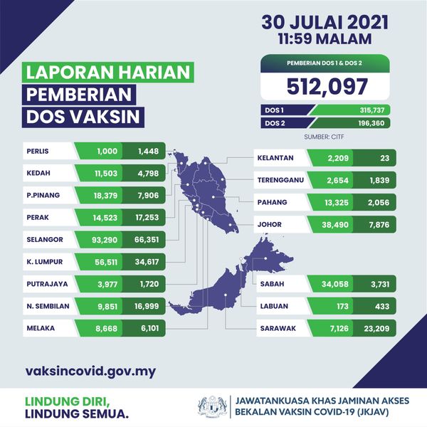 据卫生部长阿汉巴巴于7月31日在推特分享的资讯图,我国单日施打仍维持在50万剂以上。