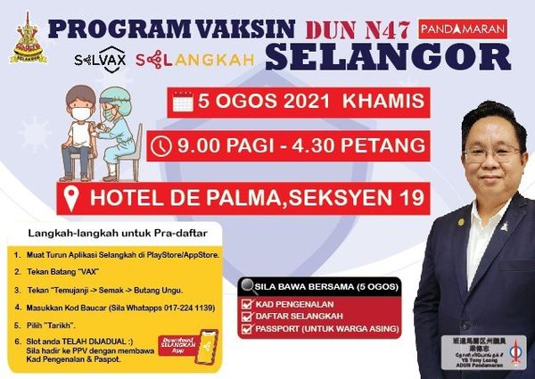 (莎阿南3日讯)雪州冠病疫苗接种计划(SelVAX)班达马兰州选区站将于8月5日举行,民众可率先通过Selangkah应用程式登记。