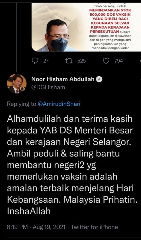 “非常感谢大臣及雪州政府,关怀及互相帮助需要疫苗的州属,对来临的国庆而言是好的行为。”