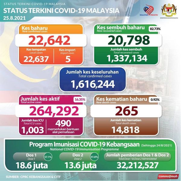 他说,我国今日新增2万2642宗确诊病例,其中5宗属于境外输入病例,累计的确诊病例达161万6244宗。