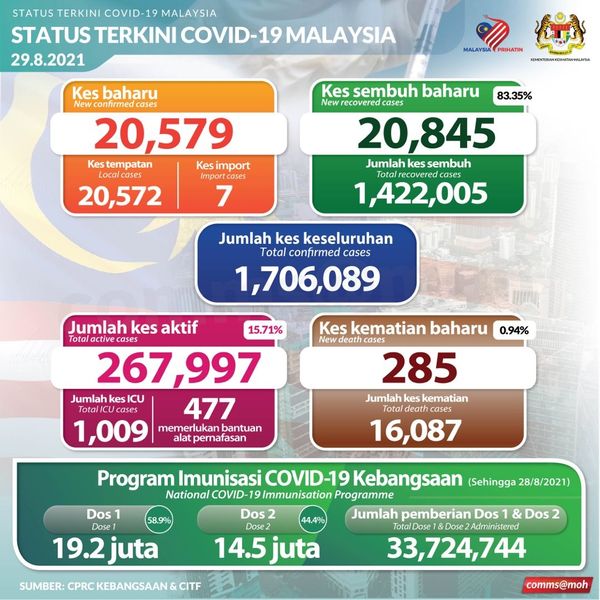据卫生部官方脸书8月29日的数据图,我国单日确诊病例今日通报2万579宗,其中7宗为境外输入,累计病例170万6089宗。