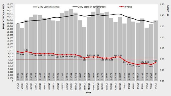 (莎阿南9日讯)我国新冠肺炎单日确诊病例昨日通报1万9733宗,全国冠病基本传染数值(Ro)报0.97。