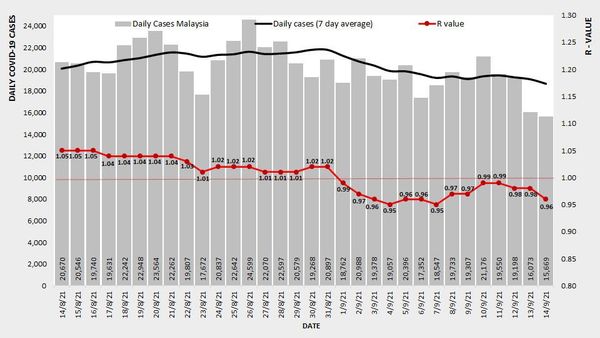 (莎阿南15日讯)我国的新冠肺炎单日确诊病例昨日通报1万5669宗,全国传染基数(Ro)降至0.96,惟雪兰莪传染基数却从0.81升至0.83。