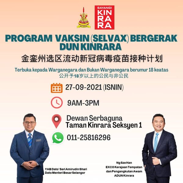 雪州冠病疫苗流动接种计划于9月12日展开,确保州内所有成人完成接种,没有被遗漏在免疫群体外。详情可追随SELangkah官方脸书,查看流动疫苗车的地点。