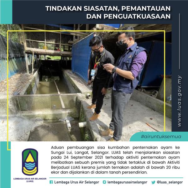 (莎阿南29日讯)乌鲁冷岳县一家养鸡场的污水污染双溪镭河(Sungai Lui),雪州水务管理局(LUAS)下令业者立刻改善排污系统,以免污水污染邻近的河流。