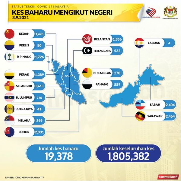 据卫生总监丹斯里诺希山9月3日在脸书专页发布的数据,雪兰莪州仍是最高病例的州,报3613宗,州内累计确诊病例61万5392宗。