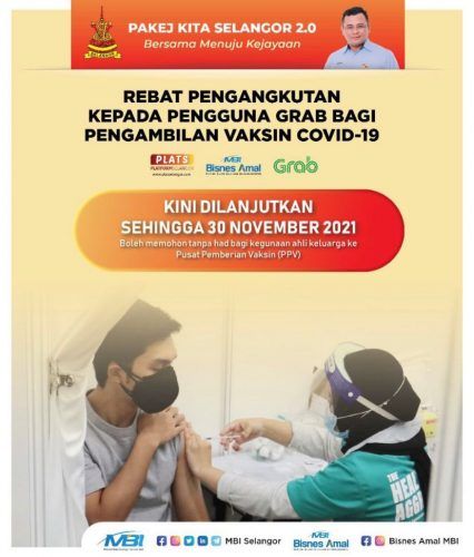 在这项计划下,凡乘搭Grab电召车服务前往接新冠疫苗接种中心(PPV)的民众,在双程路途中可获得20令吉车资折扣。