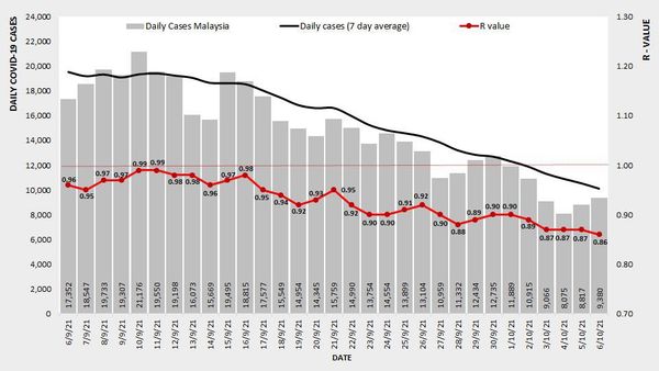 (莎阿南7日讯)我国新冠肺炎单日确诊病例昨日新增9380宗,全国冠病基本传染数值(Ro)降至0.86。
