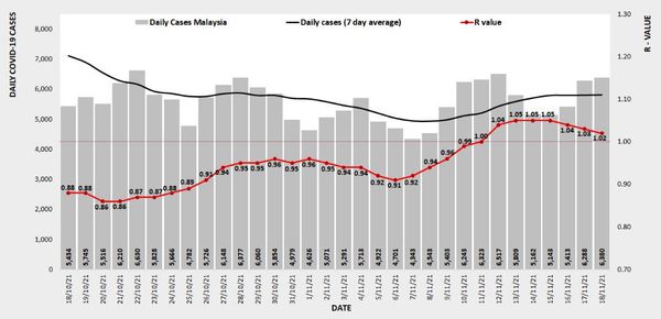 (莎阿南19日讯)我国新冠肺炎单日确诊病例昨日新增6380宗,全国冠病基本传染数值(Ro)报1.02。