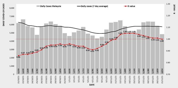 卫生总监丹斯里诺希山11月22日在脸书公布的数据显示,全国周日单日新增4854宗冠病,传染数值略降,于19日及20日保持在1.01,昨日再微降至1.00。