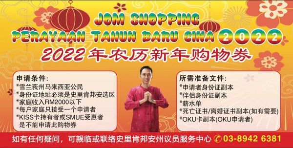 (莎阿南10日讯)斯里肯邦安州选区即日起,开放2022年农历新年购物卷申请,让低收入群过个好年!