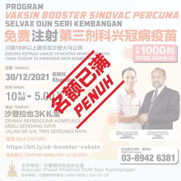 (莎阿南16日讯)由史里肯邦岸州选区主办的雪州冠病疫苗加强剂接种计划,在短短6小时内,1000剂科兴疫苗预约额满!
