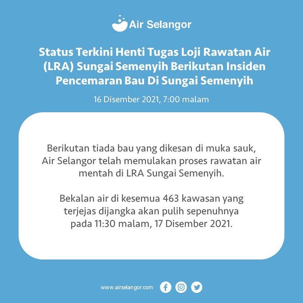 雪州水供管理有限公司(Air Selangor )于晚上7时许,在官方脸书,发布上述最新消息。