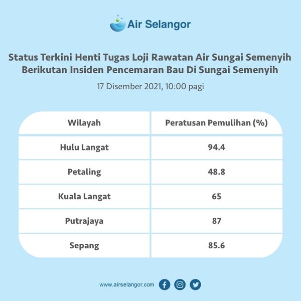 用户可通过Air Selangor社交媒体,如脸书、推特及Instagram查看最新情况,或拨打电话15300,或是查阅官网:www.airselangor.com 。