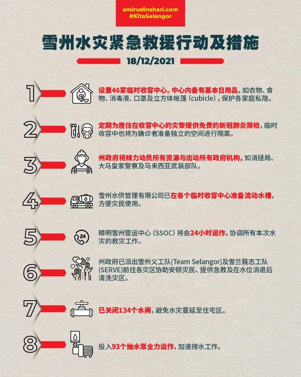 雪州大臣拿督斯里阿米鲁丁表示,州政府从12月18日起积极抽调所有资源,进行多项水灾紧急救援行动及措施。