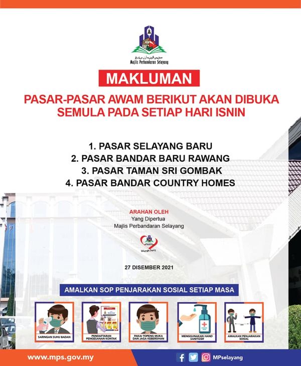 (莎阿南28日讯)士拉央市议会即日起,允许辖内4大公共巴刹于每星期一营业。