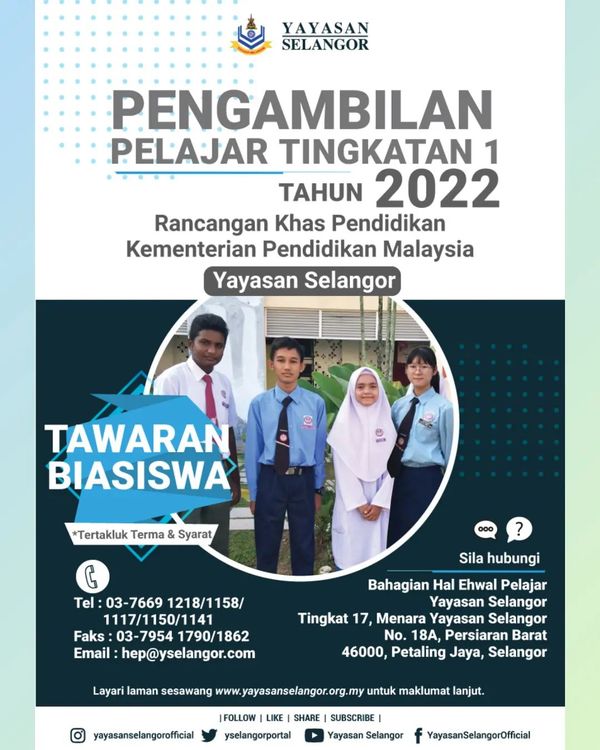 - 申请学生或家长出生在雪兰莪州,或在雪兰莪定居至少10年。