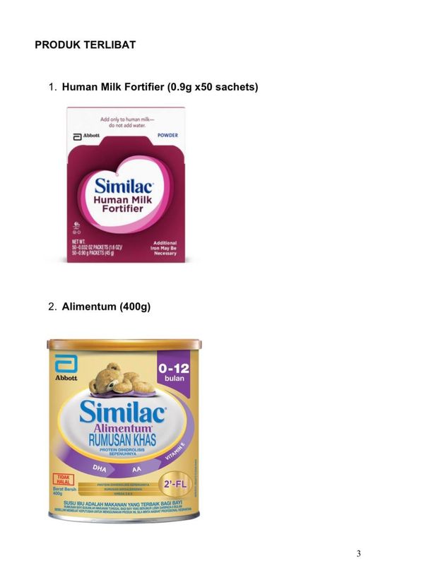 卫生总监丹斯里诺希山2月23日在文告中说,由于美国食品药品监督管理局(FDA)在雅培生产的两款婴儿配方奶粉中,发现阪崎肠杆菌和新港沙门氏菌,卫生部立刻下令各入境处退回相关产品,有关公司也已主动召回所有在市面上的相关奶粉。