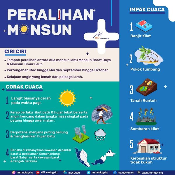 因此,气象局提醒民众在这段期间提高警惕,密切留意气象局通过官方网站、myCuaca手机应用程序和官方社交媒体所发布的天气预报和警报。