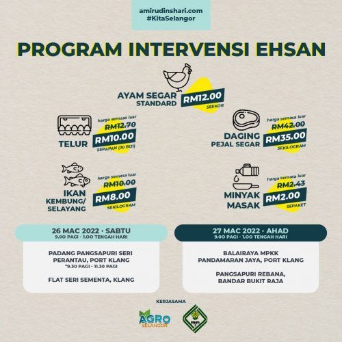 据阿米鲁丁分亨的资讯图,通过“益山食品价格干预计划”,每只净鸡售卖12令吉、一托鸡蛋10令吉、牛肉每公斤35令吉、甘望鱼或吊景鱼每公斤8令吉,以及食用油每包2令吉。