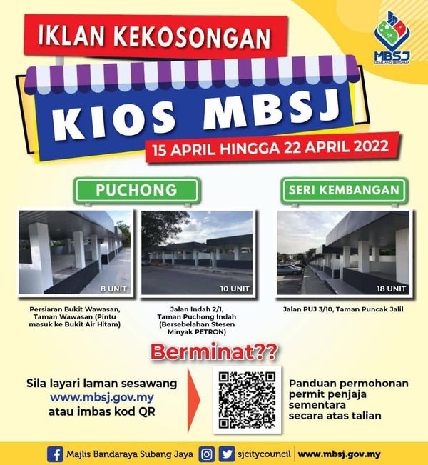 (莎阿南14日讯)梳邦再也市政厅(MPSJ)于蒲种及斯里肯邦安有多个档口出租,欢迎有兴趣做小生意者洽询。