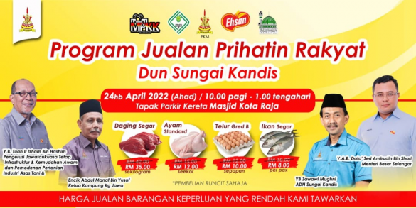 此活动每逢周未轮流在各州选区展开,以优惠价格出售各项日常食品,包括每只净鸡售卖12令吉、一托鸡蛋10令吉、牛肉每公斤35令吉、甘望鱼或吊景鱼每公斤8令吉,以及食用油每包2令吉。