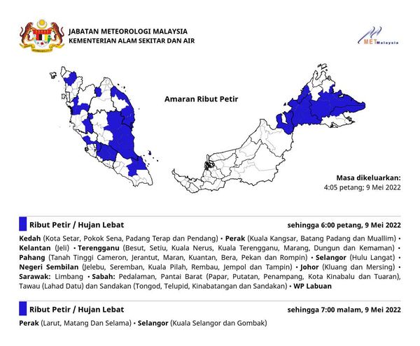 此外,其他受影响的地区也预计出现雷雨至今日傍晚6时,包括:吉打(哥打士打、波各先那、巴东得腊、笨同)、霹雳(江沙、马登巴冷、慕阿林)、登嘉楼(勿述、士兆、瓜拉尼鲁斯、瓜拉登嘉楼、马兰、龙运以及甘马挽)、彭亨(金马仑高原、而连突、马兰、关丹、百乐、北根、云冰)、森美兰(日拉务、芙蓉、瓜拉庇劳、林茂、仁保、淡边)、柔佛(吉銮、丰盛港)。