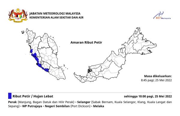 据大马气象局今早8时45分在官方脸书的贴文,雪州涉及地区包括沙白安南县、瓜拉雪兰莪县、巴生县、瓜拉冷岳县及雪邦县。