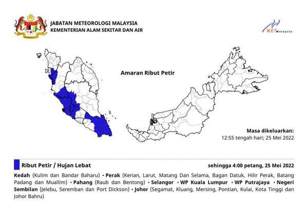 大马气象局今日下午在官方脸书贴文指出,其他受影响的地区包括:吉打(居林、万拉峇鲁)、霹雳(吉辇、拉律马登司南马、峇眼拿督、下霹雳、马登巴冷、慕阿林)、彭亨(劳勿、文冬)、森美兰(日拉务、芙蓉、波德申)、柔佛(昔加末、吉銮、丰盛港、笨珍、古来、哥打丁宜、新山),同样出现雷雨至下午4时。
