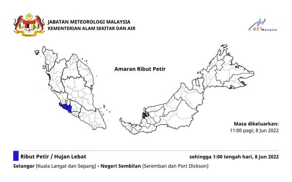 根据马来西亚气象局今早11时更新的天气预告,雪兰莪(瓜拉冷岳、雪邦)以及森美兰(芙蓉、波德申)将出现雷雨至下午1时。